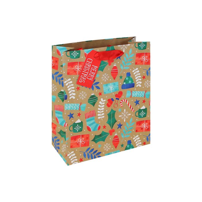 Eurowrap - Holly Jolly Brown Kraft - Large Gift Bag