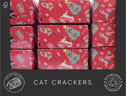 Our pet crackers don’t include a snap, but instead contain a novelty ‘bang’ card. Plastic free and with a twist neck, a petcentric joke and toy inside, they are a purr-fect way to keep your pet busy this festive season. Twist neck cracker with no ties contains a toy mouse.