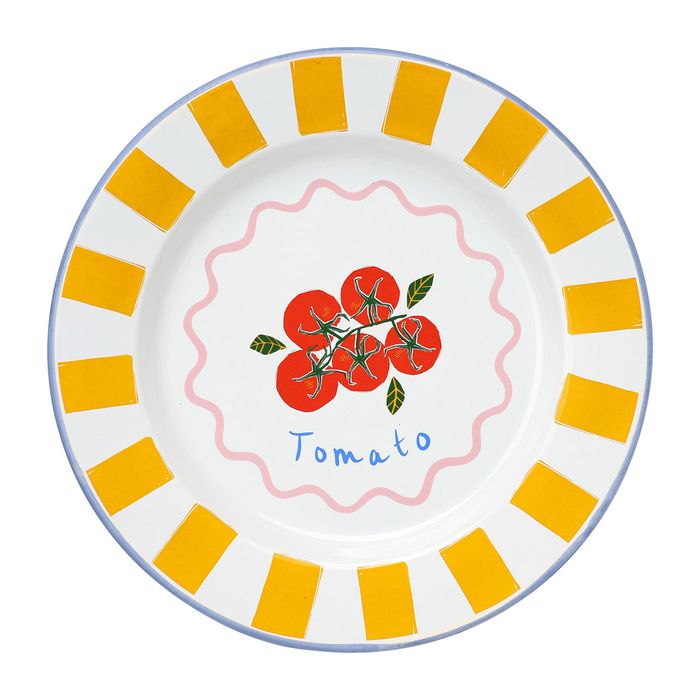 Introducing joy in plate form. This new range of hand crafted enamel plates and dishes won’t help but draw attention thanks to their feel-good factor. This plate is detailed with sunshine yellow stripes, a blue trim that covers the whole of the underside and a pink wiggly circle that frames a motif of juicy tomatoes. This brightly coloured design is achieved by multiple enamel dipping. Hardwearing, lightweight and shatterproof, it’s particularly great for both picnics and relaxed indoor dining.